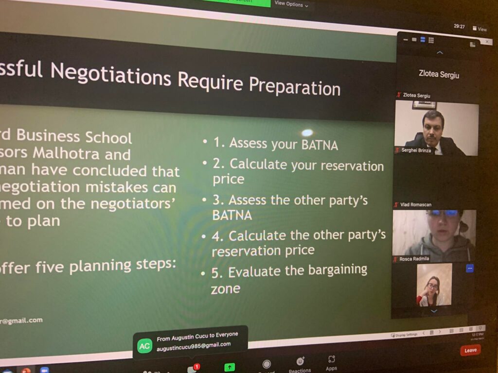 Domnul Christopher Kelley a anunțat, de asemenea, participanții că Cursul de Negociere va continua, în timpul semestrului de primăvară, 2021-2022.
