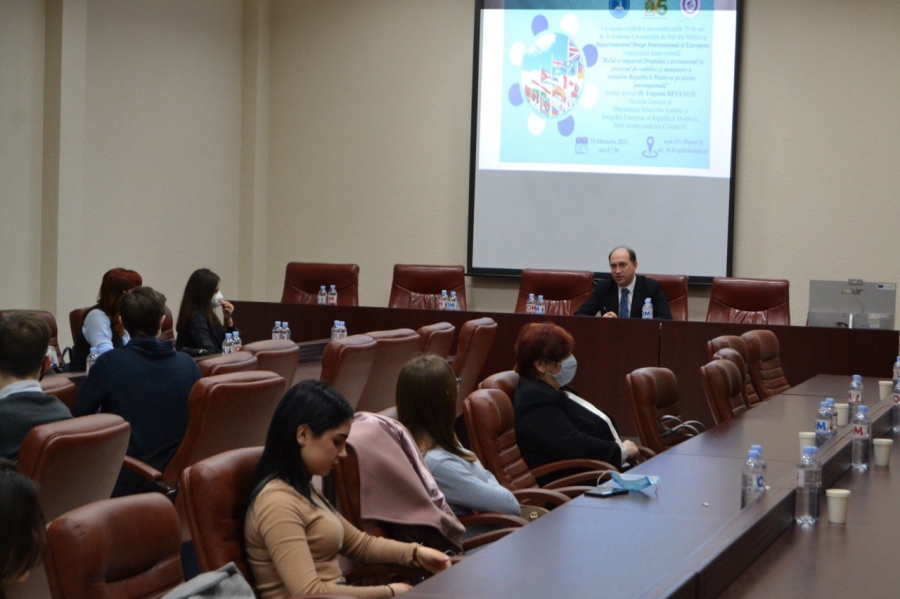 Cu ocazia celebrării aniversării celor 75 de ani de la fondarea Universității de Stat din Moldova la 24 februarie 2021 sub egida Departamentului Drept Internațional și European și-a desfășurat lucrările masa rotundă la care a fost abordat subiectul “Rolul și impactul Dreptului Internațional în procesul de stabilire și menținere a relațiilor Republicii Moldova pe arena internațională”. Evenimentul se înscrie în lista acțiunilor realizate pe parcursul anului 2021 de către membrii Departamentului Drept Internațional și European, având drept scop organizarea întâlnirilor cu personalități notorii, absolvenți ai Facultății de Drept a Universității de Stat din Moldova. În acest context, primul invitat a fost Domnul Eugeniu REVENCO, Secretar General al Ministerului Afacerilor Externe și Integrării Europene al Republicii Moldova.
