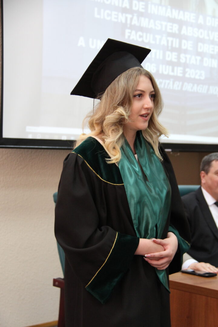 Diplomele de studii au fost înmânate absolvenților în cadrul unei ceremonii, la care a participat rectorul USM, Igor Șarov, prim-prorectorul USM, Otilia Dandara, decanul Facultății de Drept, Sergiu Brînză, șefii de Departamente, cadrele didactice și apropiații absolvenților.