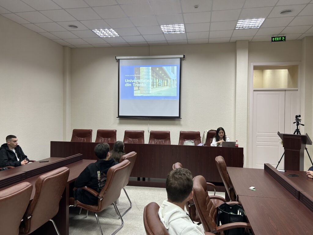La data de 16 octombrie, 2023, Departamentul Drept Internațional și European, Facultatea de Drept, Universitatea de Stat din Moldova în colaborare cu Asociația Studenților în Drept, au organizat masa rotundă: „Îmbunătățirea experienței de învățare ca student. Bune practici ale Universității din Trento”. Invitata evenimentului a fost Daniela Chiper, studentă la Universitatea din Trento, care în perioada august-noiembrie 2023 se află în mobilitate academică la Universitatea de Stat din Moldova, Facultatea de Drept, Departamentul Drept Internațional și European.