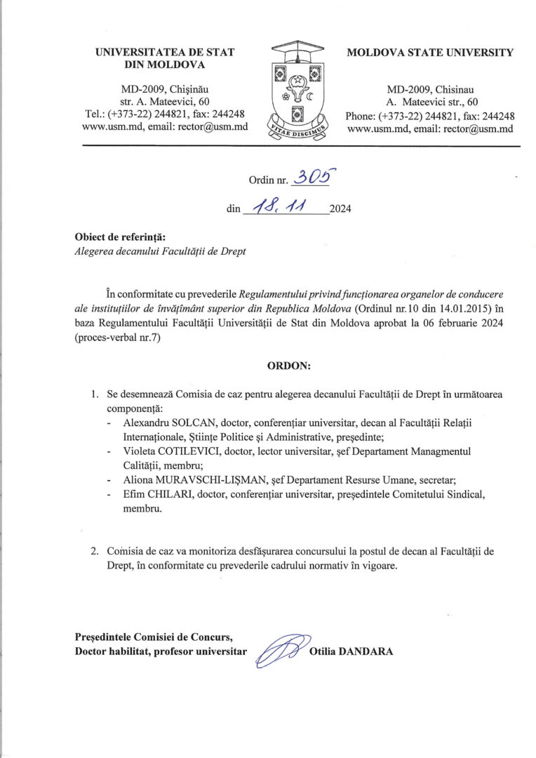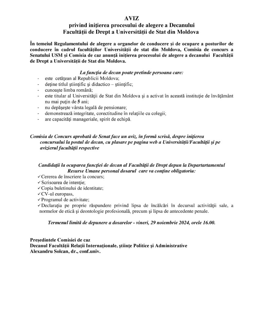 AVIZ privind iniţierea procesului de alegere a Decanului Facultăţii de Drept a Universităţii de Stat din Moldova