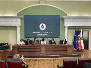 Evenimentul a fost moderat de Caroline Berger, conferențiar universitar la Universitatea Nîmes (Franța), și Ciprian Balmuș, masterand la Facultatea de Drept a USM.