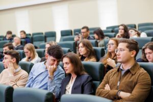 👩⚖️ În sală au fost prezenți studenții anilor III și IV, alături de Lilia Gribincea, dr. în drept, conf. univ., șefa Departamentului Drept Internațional și European și Gavrilenco Natalia, prodecan.